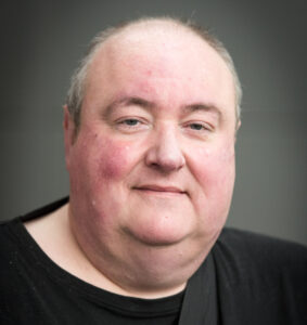 Kelvin, a white man with light hair pictured in front of a grey wall. He's looking at the camera and wears a black top.
