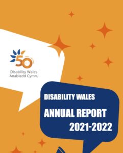 Disability Wales 2021-22 annual report front cover which has the DW 50th anniversary logo in a white speech bubble and the words Disability Wales annual report 2021-2022 in white text in a blue speech bubble. The organisation's trademark orange/gold colour fills the rest of the page.