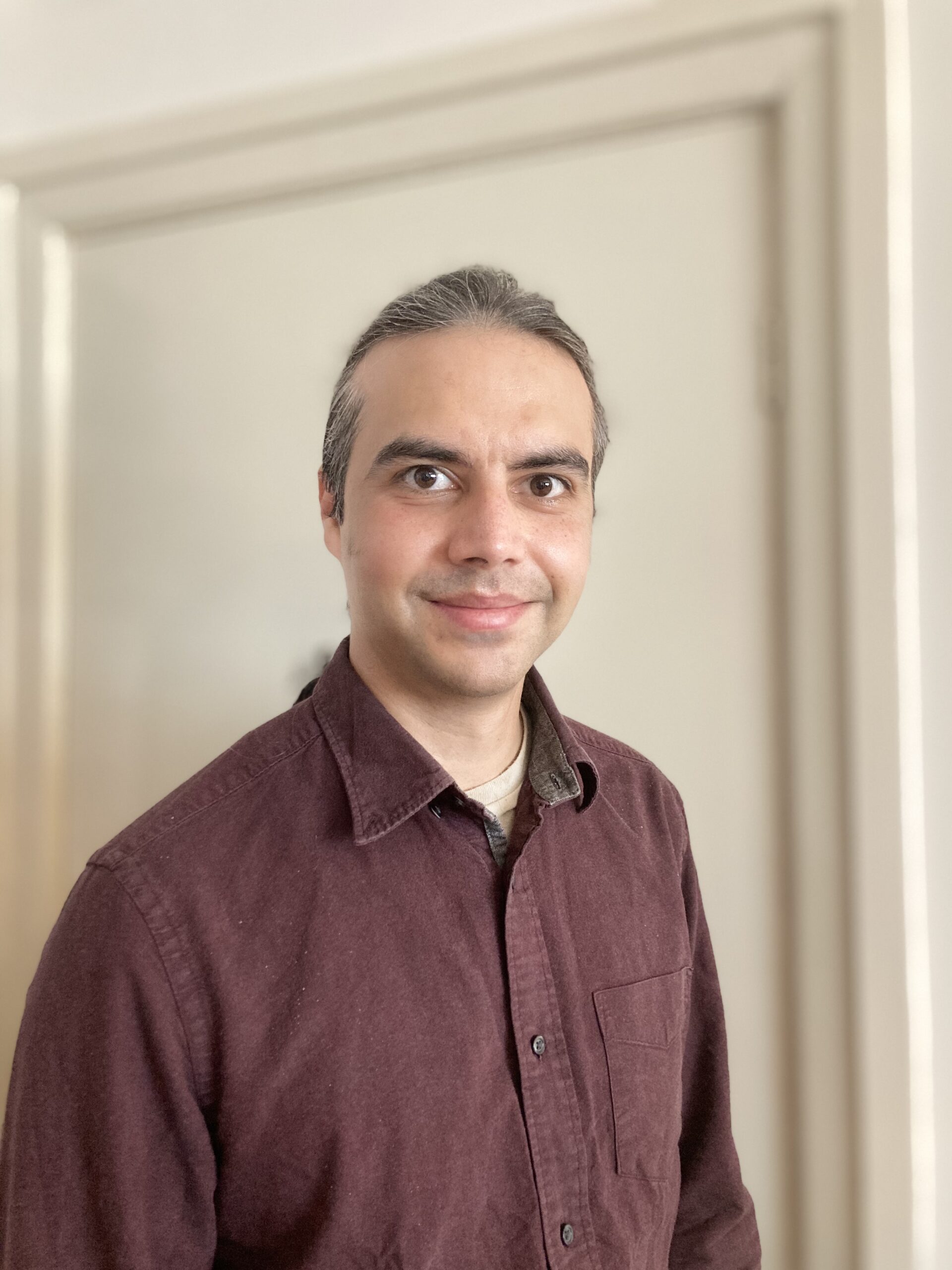 Linus standing in front of a light coloured wall. He wears a maroon button up shirt and his hair is pulled back.
